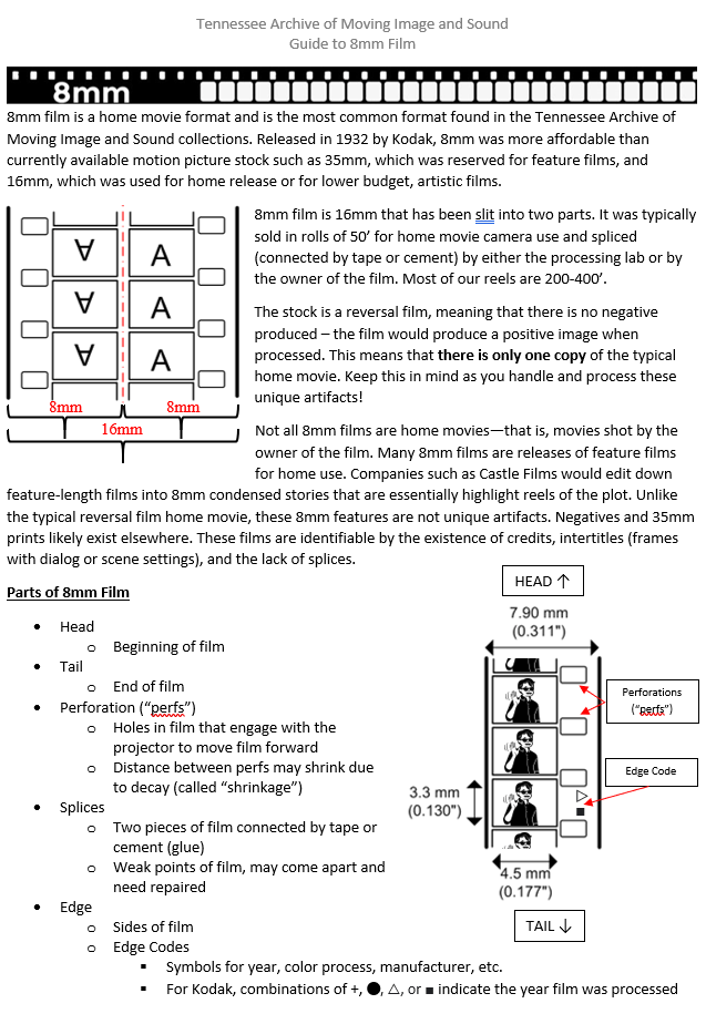 I created this resource for as a quick introduction to 8mm film for a practicum student who was new to handling film. Feel free to use and edit this document however you see fit, including retooling it for different formats. I only wanted it to be one page, so I did not include other important information such as identifying base and emulsion.