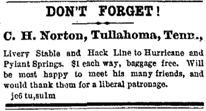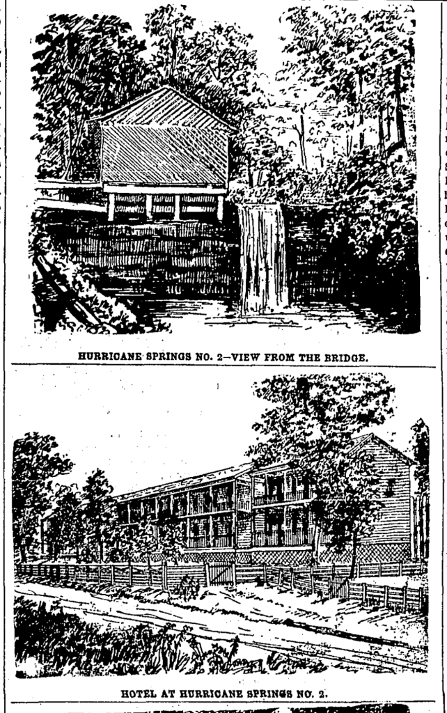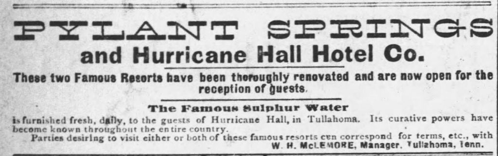The two Tullahoma resorts of Hurricane and Pylant were linked in the early years, before the ownership changed hands and management split between the two. However, advertisements for one usually mentioned the other as a way to raise awareness, especially as the waters shared similar properties. Briefly, in 1887, Pylant Springs became “Hurricane Springs No. 2.” According to an article in The Tennessean, monthly rates ranged from $25-55, weekly $10-15, and daily $2-2.50.
