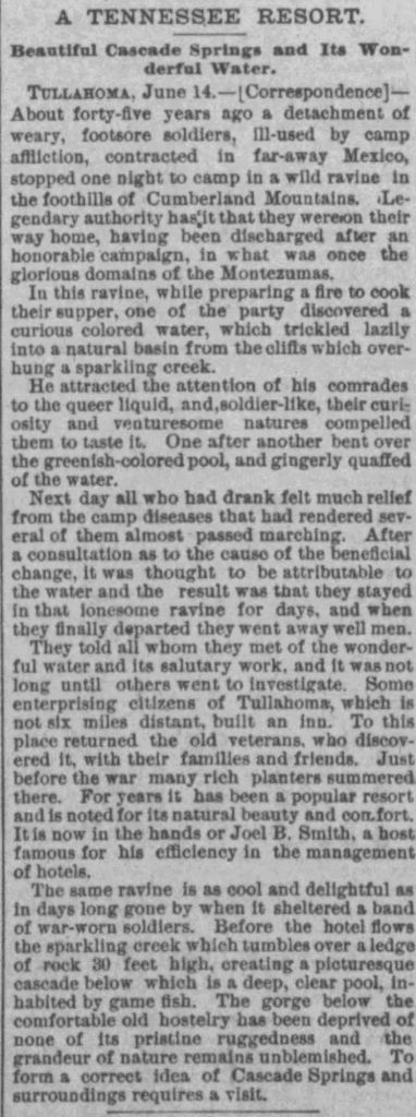 By 1883, Pylant Springs was well-established and could now host about 100 guests. An article in the Nashville Banner (advertising the resort as Cascade Springs) described the property as follows: