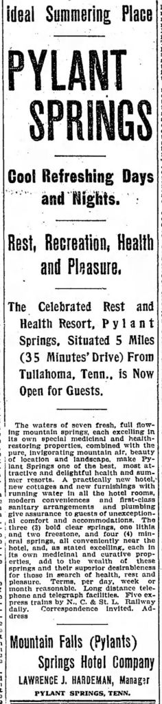 From 1905 to 1908, advertisements for Pylant Springs (briefly Mountain Falls Springs) were extensive. Multiple long articles celebrated the resort’s beautiful scenery, hotel accomodations (now with toilets!), and healing waters. Improvements were extensive, with apparently a new lake planned for fishing. Roads allowed for easier travel between Pylant Springs and Tullahoma, meaning it became easier for guests to arrive at the resort.